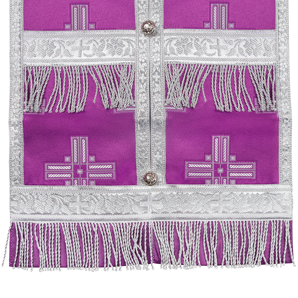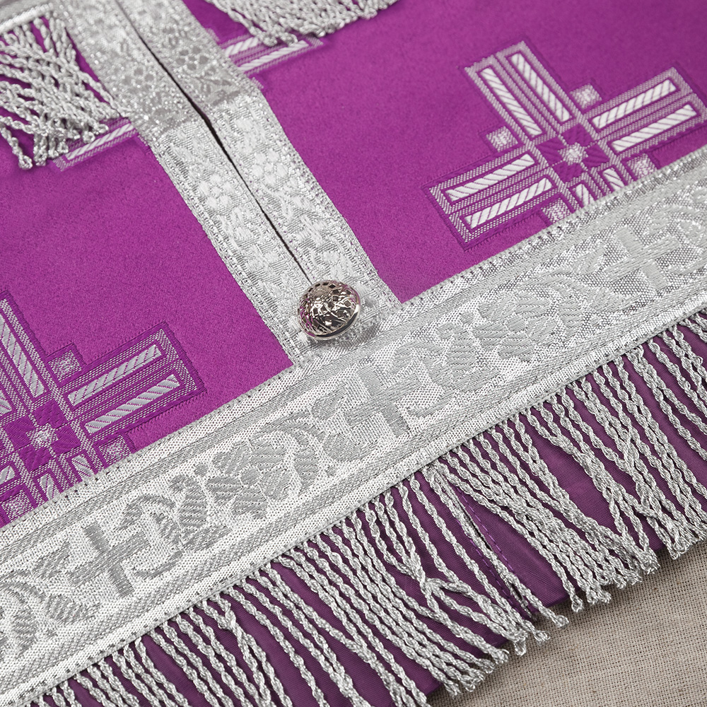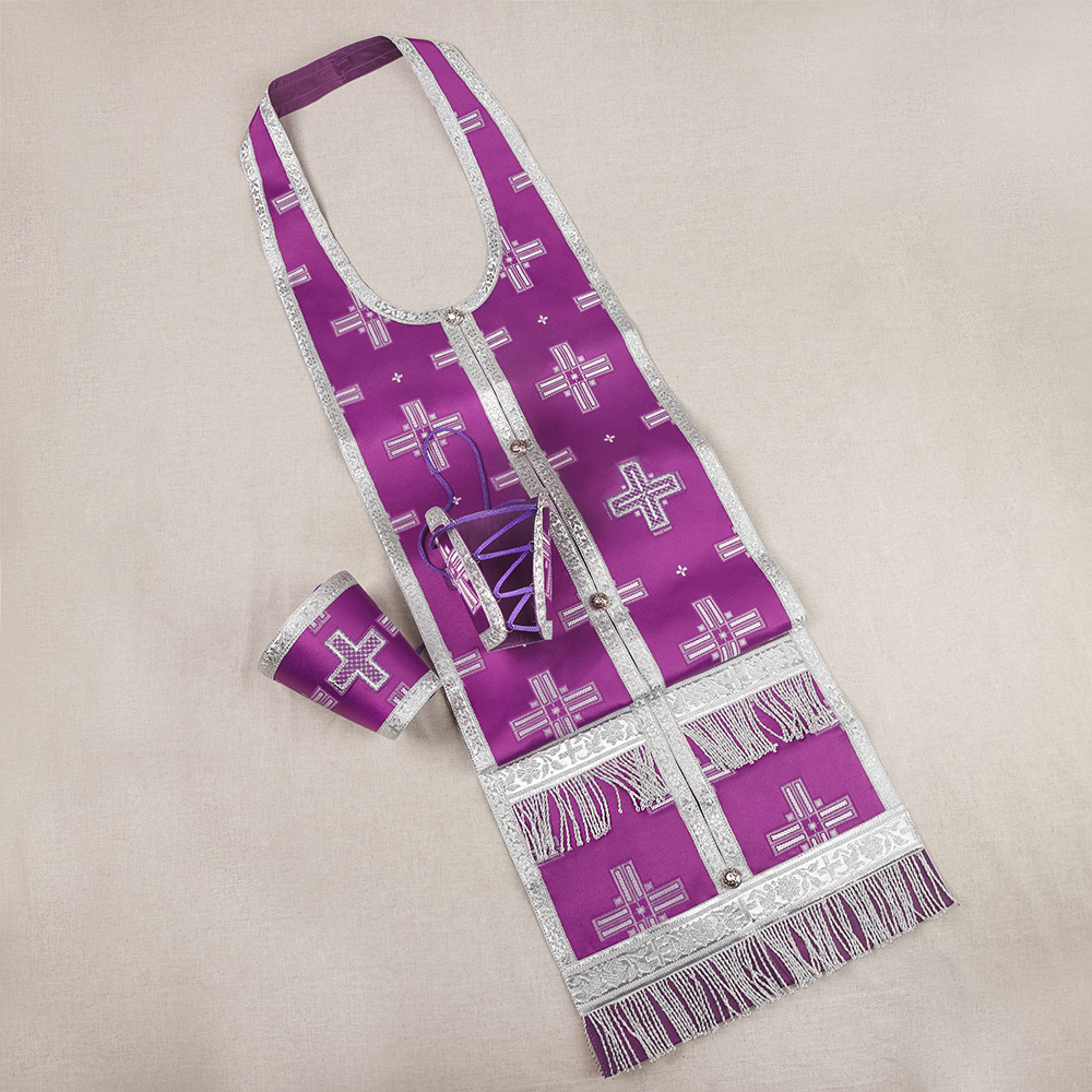 Требный комплект из искусственного шелка «Святительский» с оригинальной декоративной отделкой в цвете "фиолетовый с серебром".