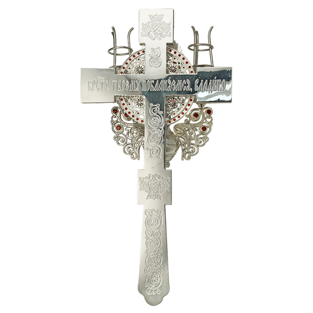 Трехсвечник пасхальный из ювелирного сплава в серебрении, фианиты, 17,5х34,5 см