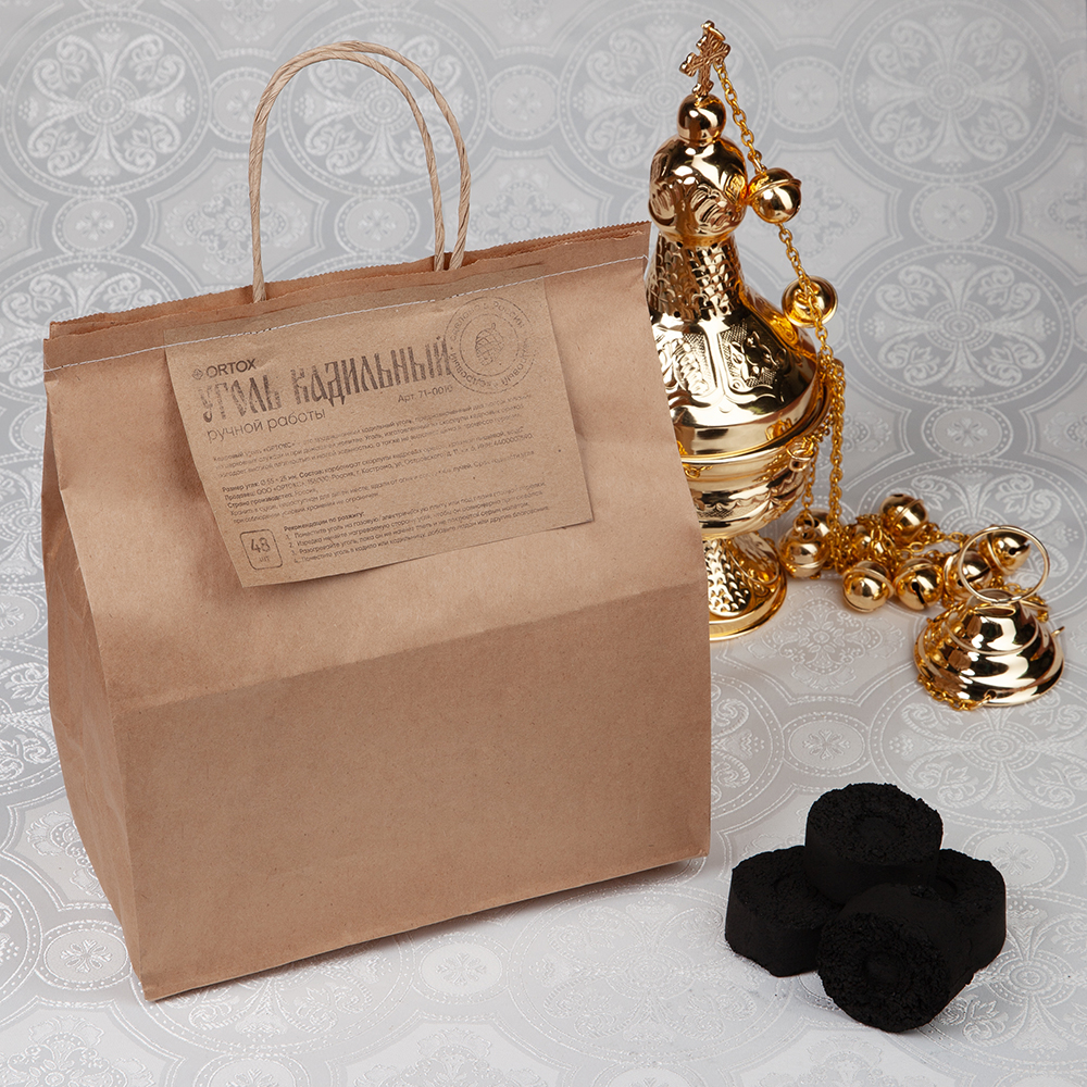 Для производства кадильного угля использована очищенная скорлупа кедрового ореха. Сырье проходит тщательную обработку по экологически безопасной технологии на специальном оборудовании. До 99% состава составляет чистый углерод, вредные примеси отсутствуют. Поэтому при горении уголь не выделяет большое количество дыма и не образует искры, а также сохраняет первоначальную форму. Длительность его горения составляет 2,5-3 часа.