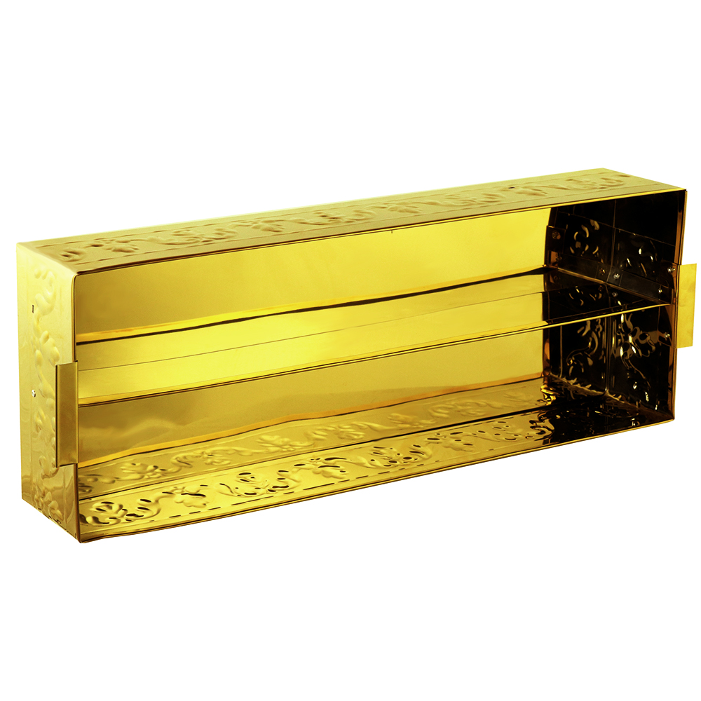 Ящик для огарков серии «Иерусалимская» изготовлен из металлического сплава с напылением нитрида титана. Поверхность боковых сторон украшает орнамент, выполненный методом чеканки. Вместительная емкость с двумя отделениями позволит аккуратно собрать огарки свечей для дальнейшей утилизации. Гладкая внутренняя поверхность легко очищается от пыли и капель воска.