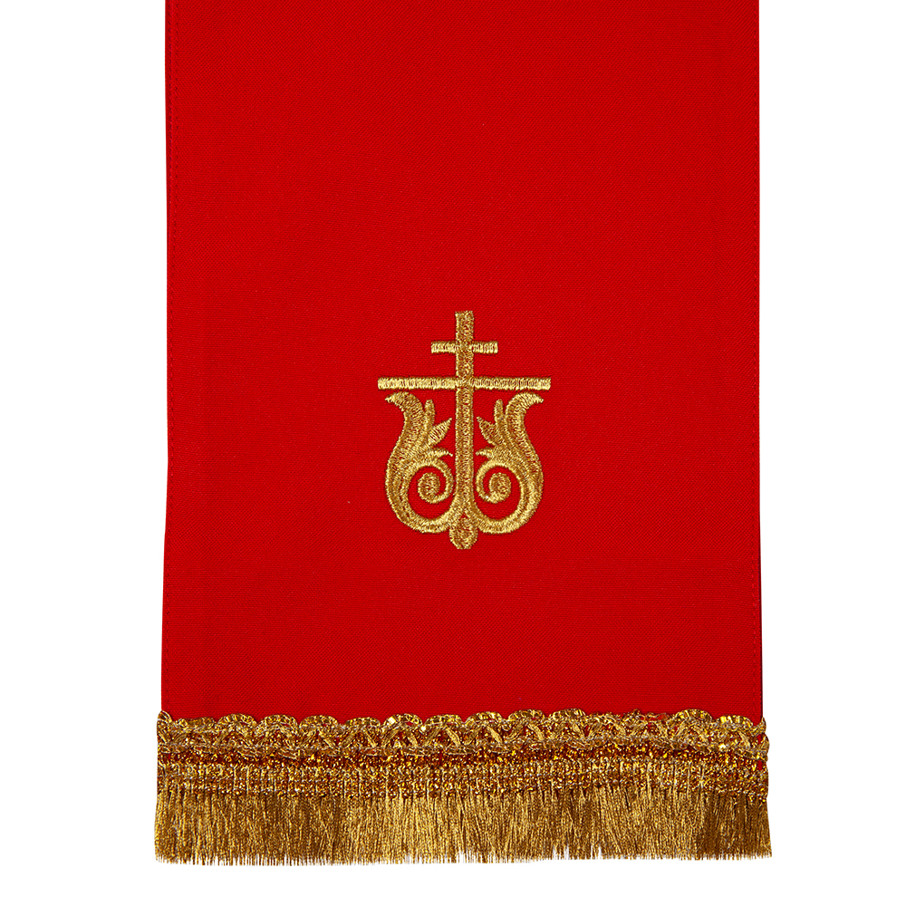 Закладка для напрестольного Евангелия из габардина с иконой Спасителя в красном цвете.