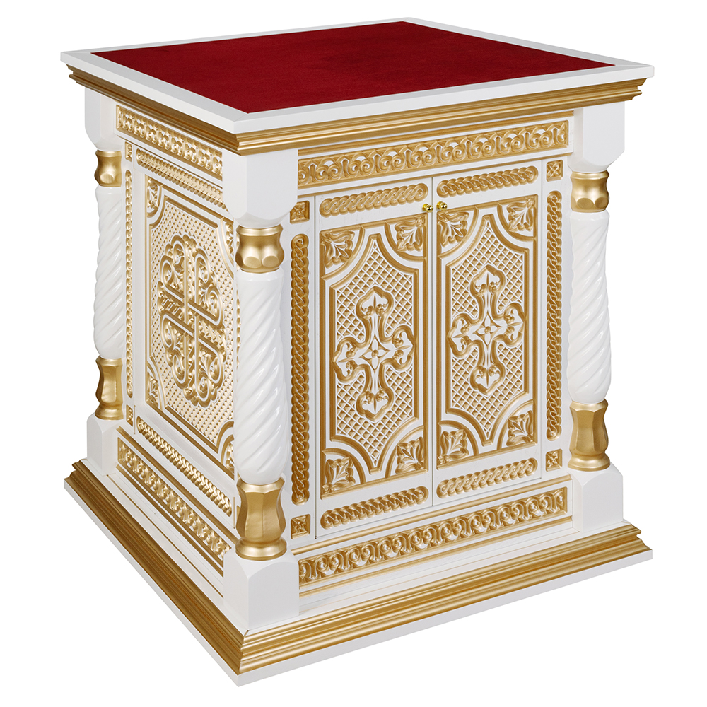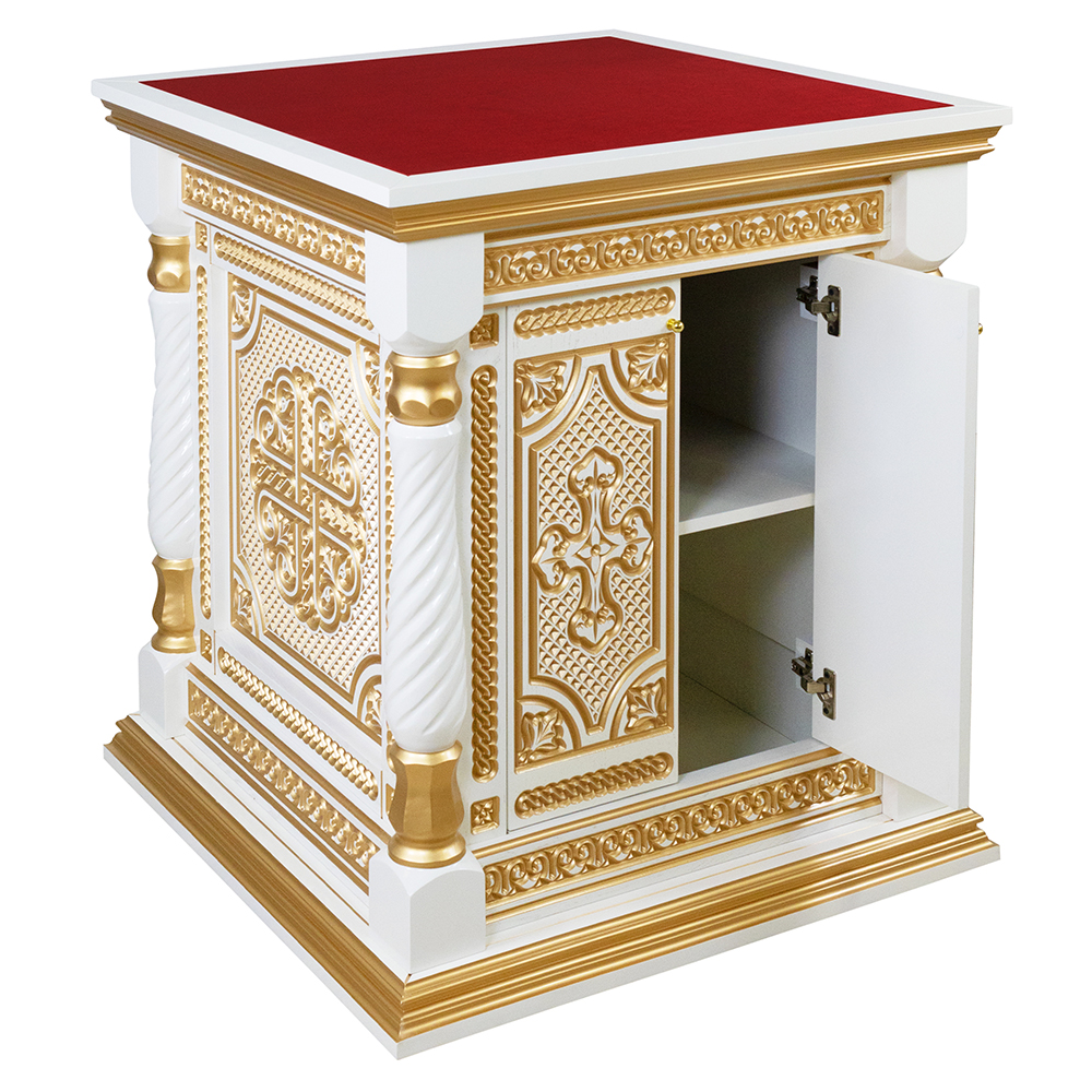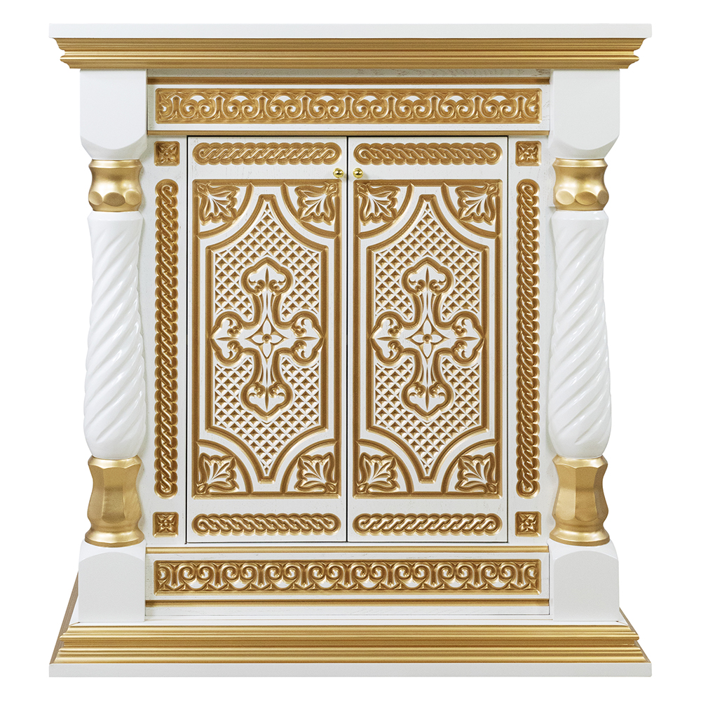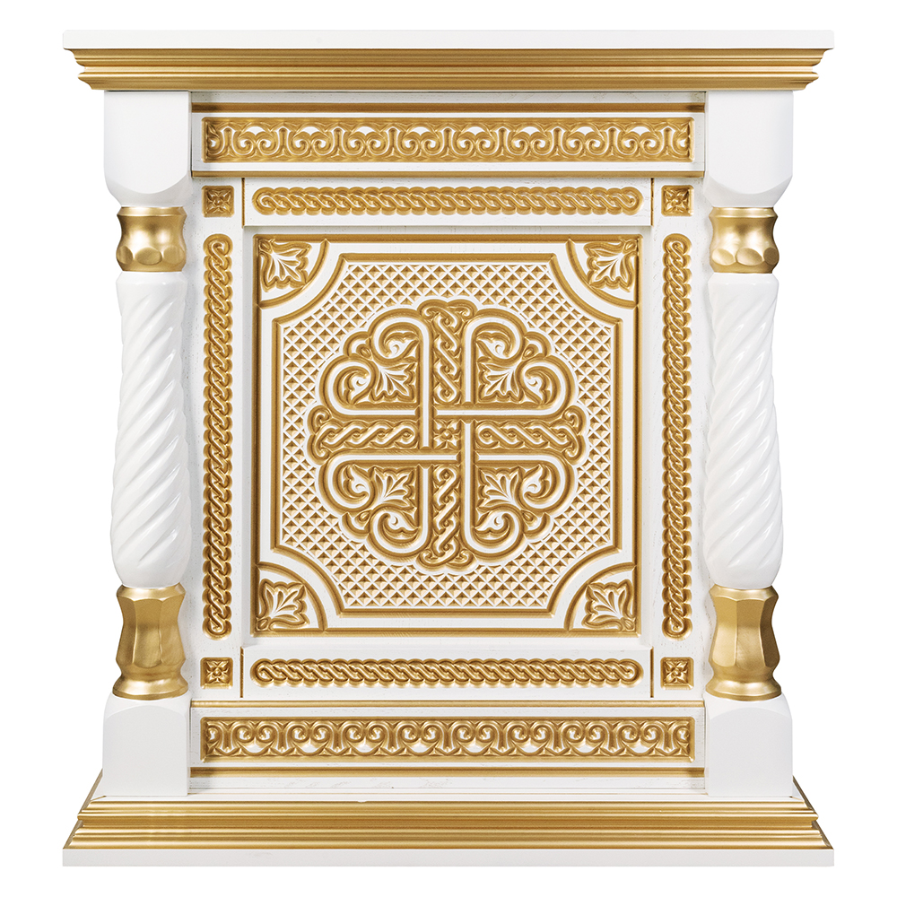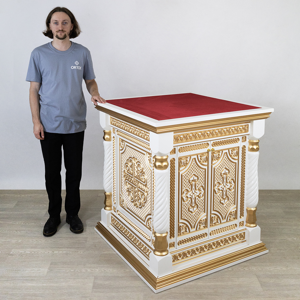 Жертвенник "Костромской" изготовлен из натурального дерева. Поверхность лицевой и боковых стенок дополнена витыми колоннами и украшена декоративной резьбой. Возможно изготовление модели в одном из четырех вариантов размеров.