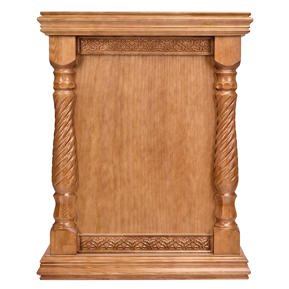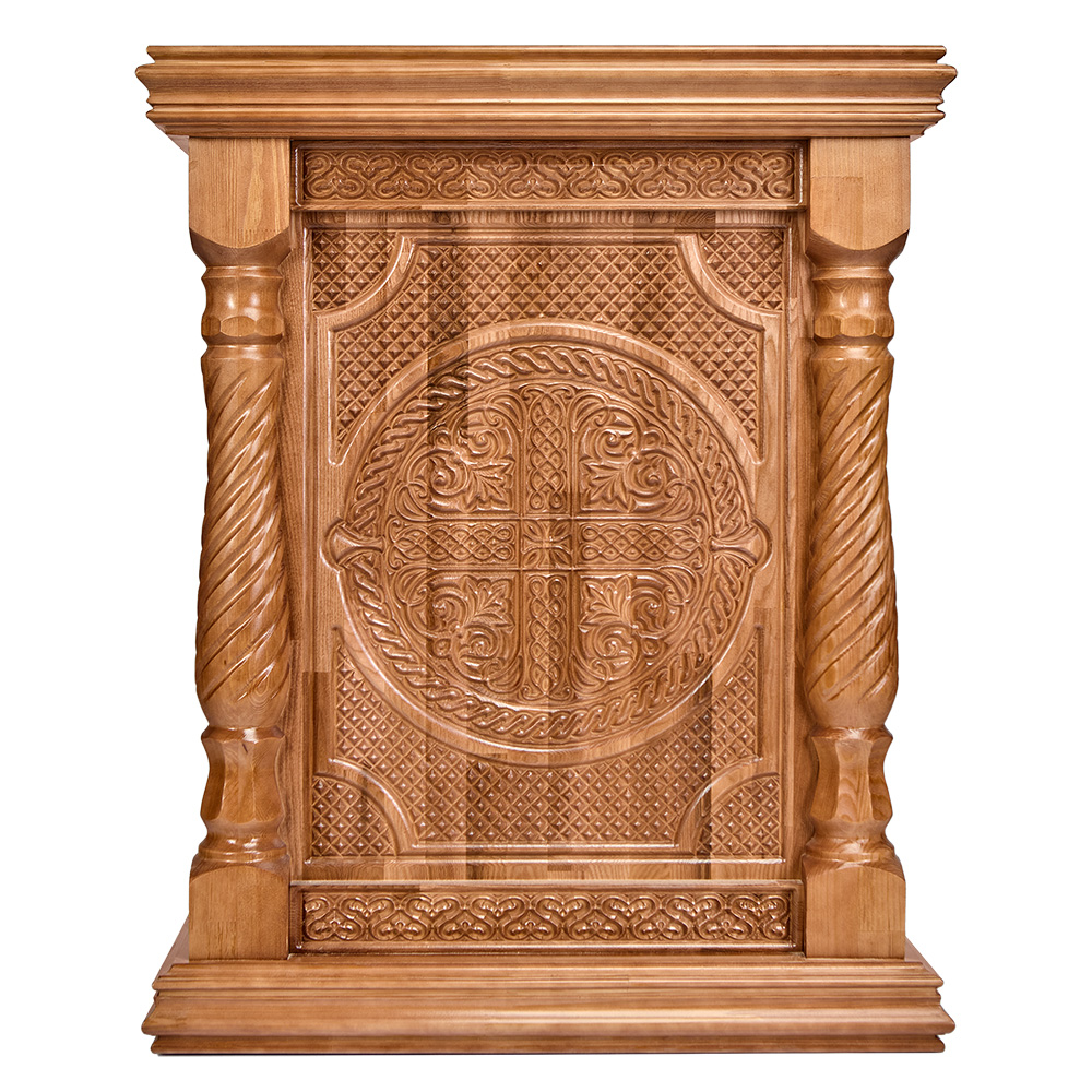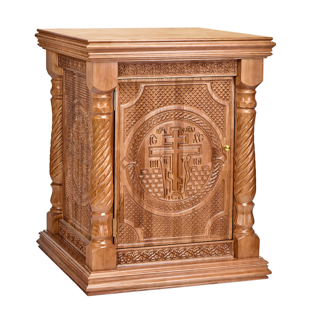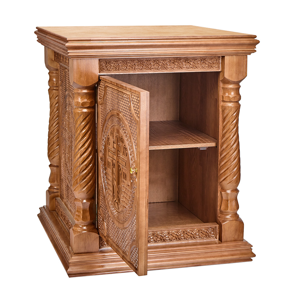 В нашей мастерской производятся жертвенники для православных храмов, которые служат настоящим украшением убранства алтаря и удобны в использовании. В данной модели жертвенника дверка и одна полочка внутри входят в стоимость.