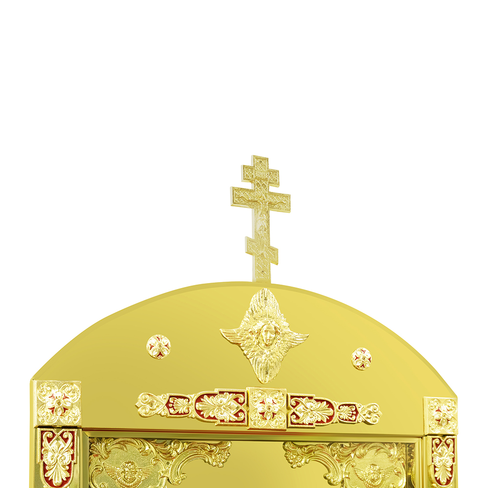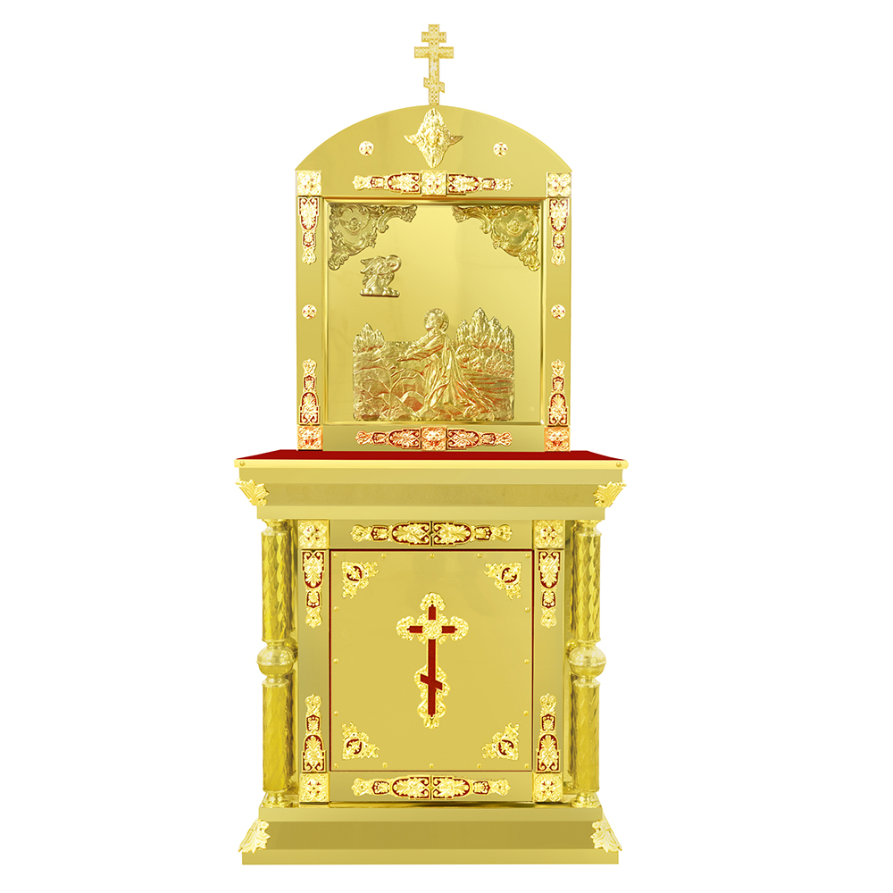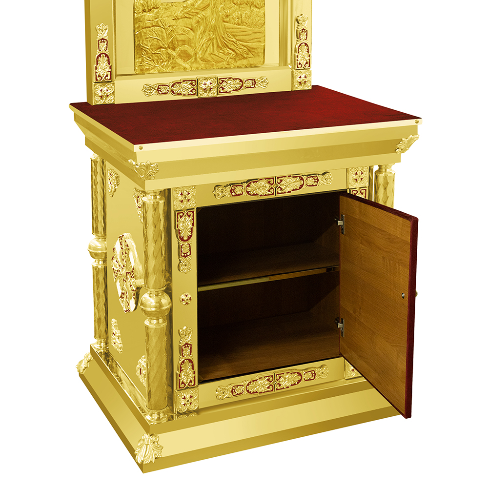 Жертвенник – важный элемент обустройства алтарной части храма, на поверхности которого совершается проскомидия. Конструкция изготовлена из нержавеющей стали с защитным напылением нитрида титана. Поверхность столешницы закрыта плотной мебельной тканью красного, синего или зеленого оттенка (на выбор покупателя). Над столешницей помещено иконописное изображение «Моление о Чаше».