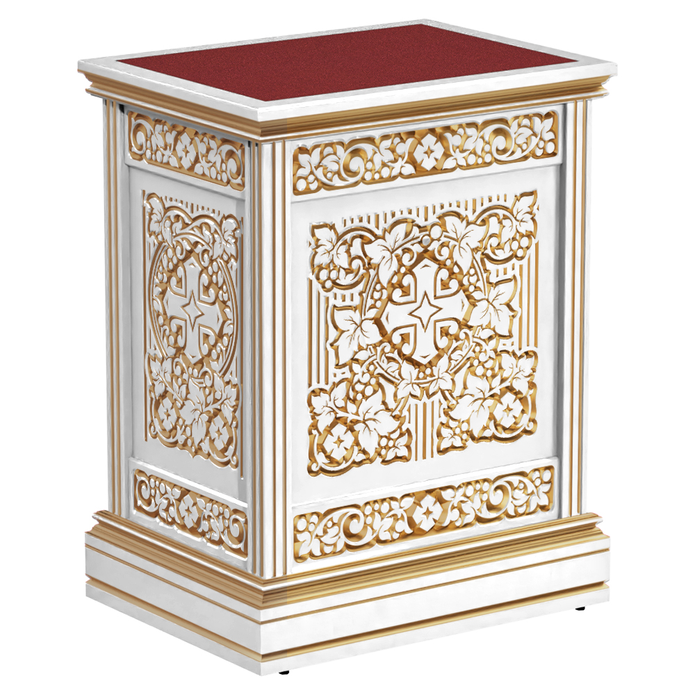Жертвенник "Суздальской" серии изготовлен из дерева и украшен декоративной резьбой. Изделие представлено в нескольких цветовых решениях — кипарис, кипарис с золотом, белый с патиной, белый с поталью, под золото, (отделка краской или поталью). На выбор покупателя предлагается размер, конструкция без дверок или с двумя распашными дверками и вместительным пространством для хранения церковной утвари.
