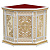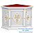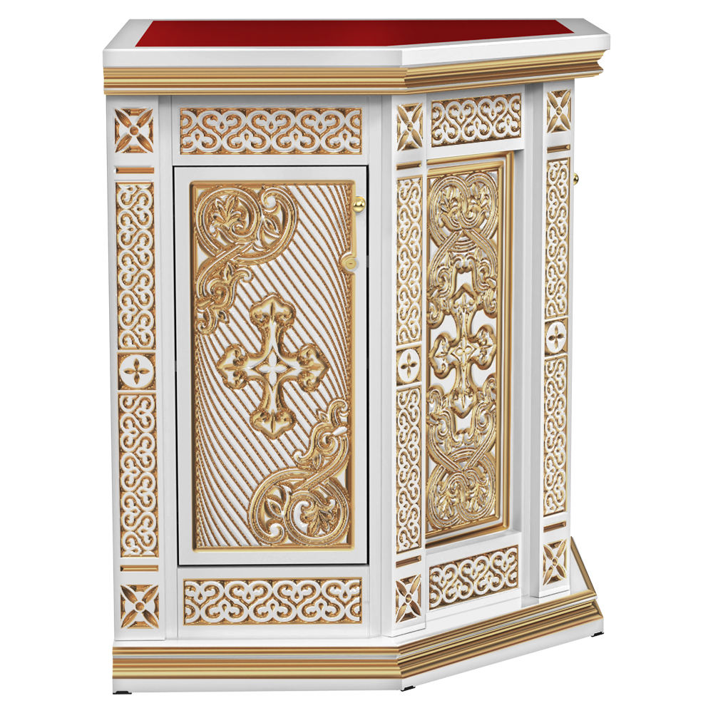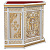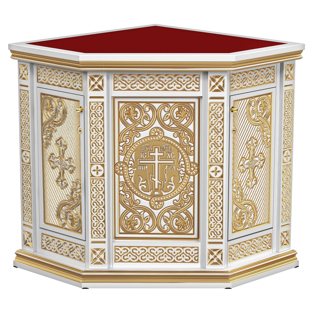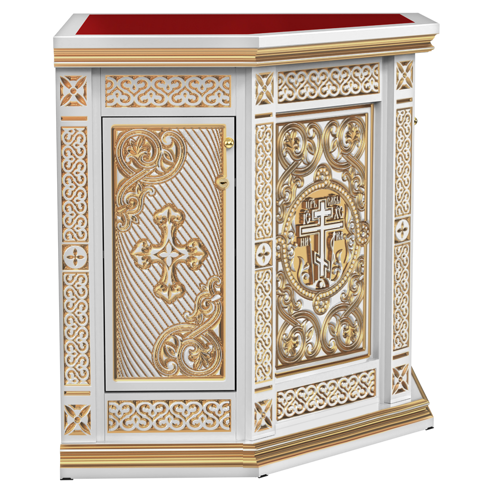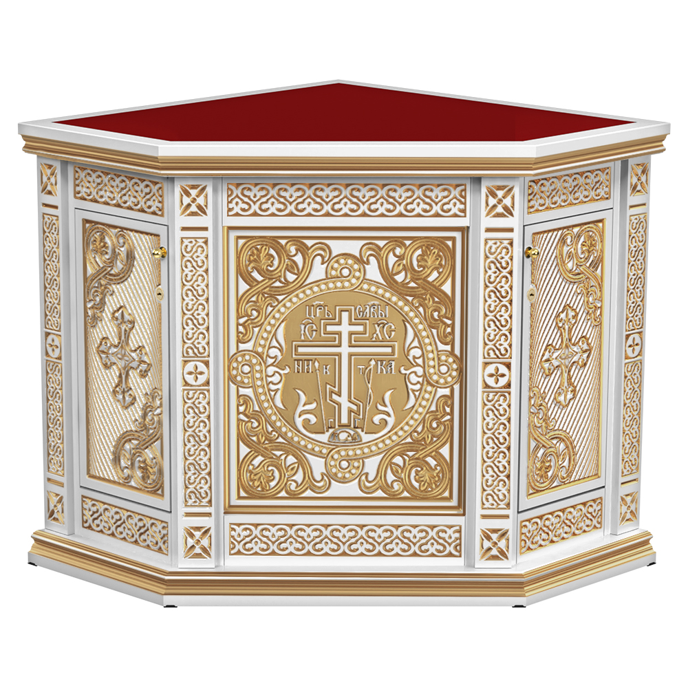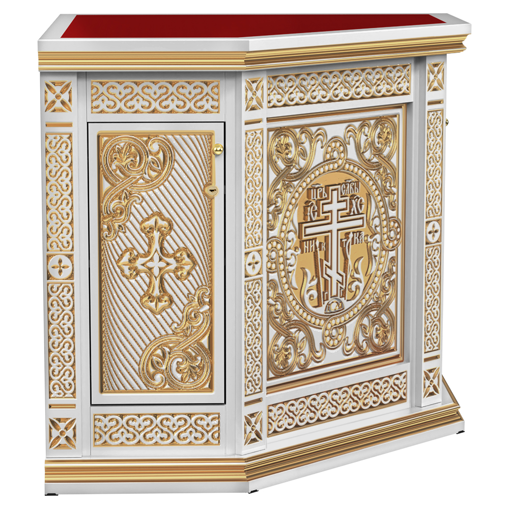 Жертвенник "Ярославский" угловой конструкции изготовлен из натурального дерева. Для отделки столешницы выбрана красная мебельная ткань. Передняя и боковые стенки украшены орнаментальной резьбой. За дверками скрывается вместительное внутреннее пространство. Возможно изготовление жертвенника в трех вариантах размеров.