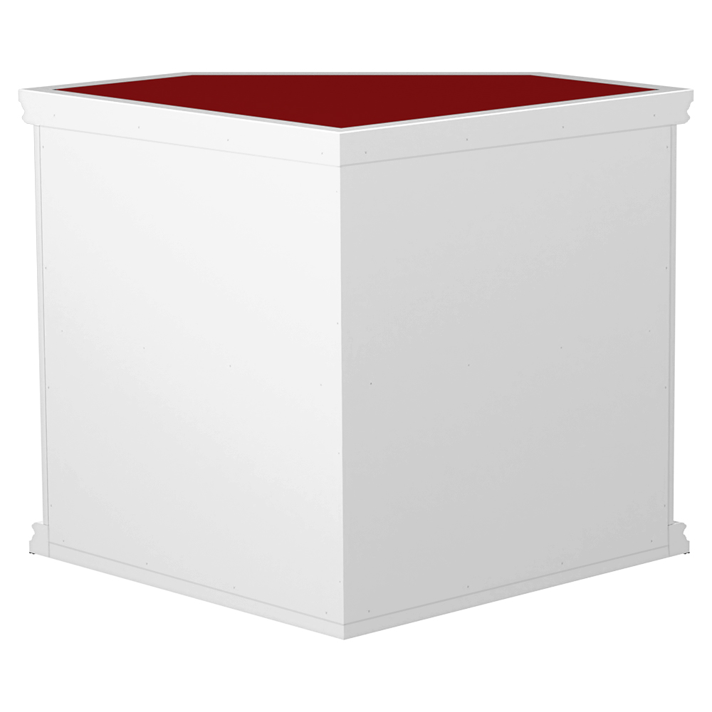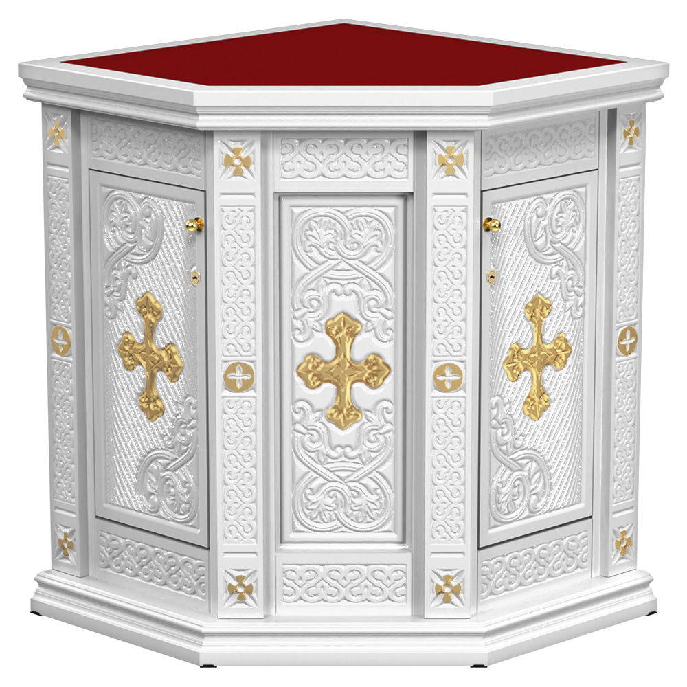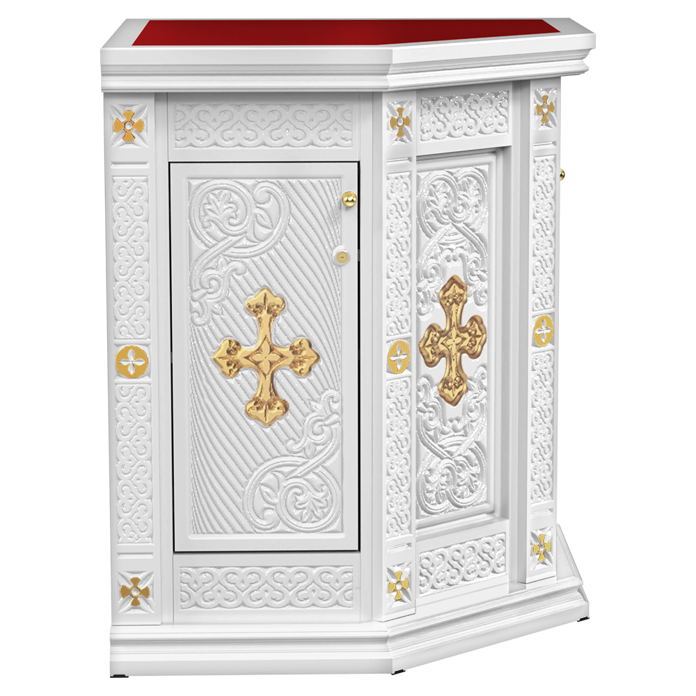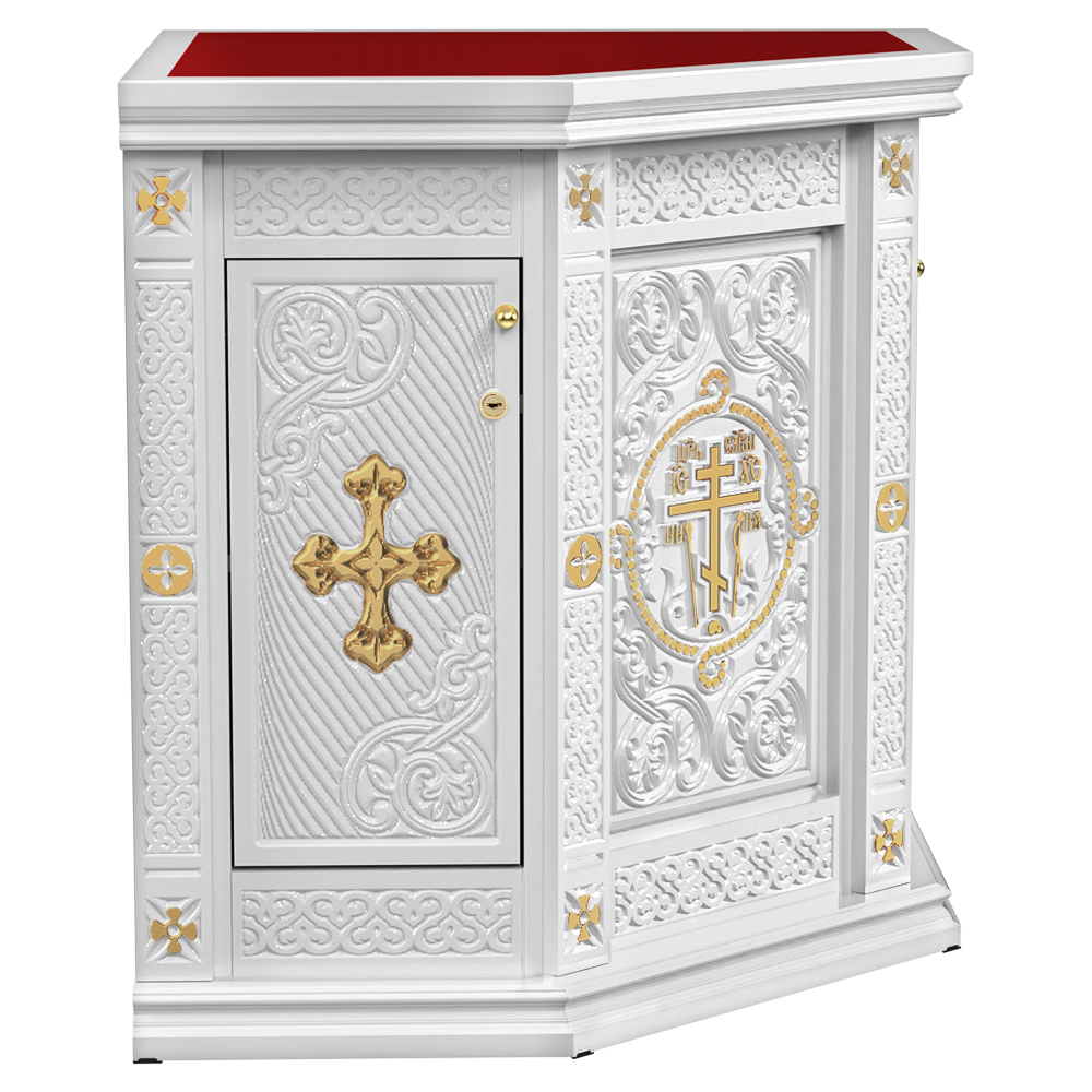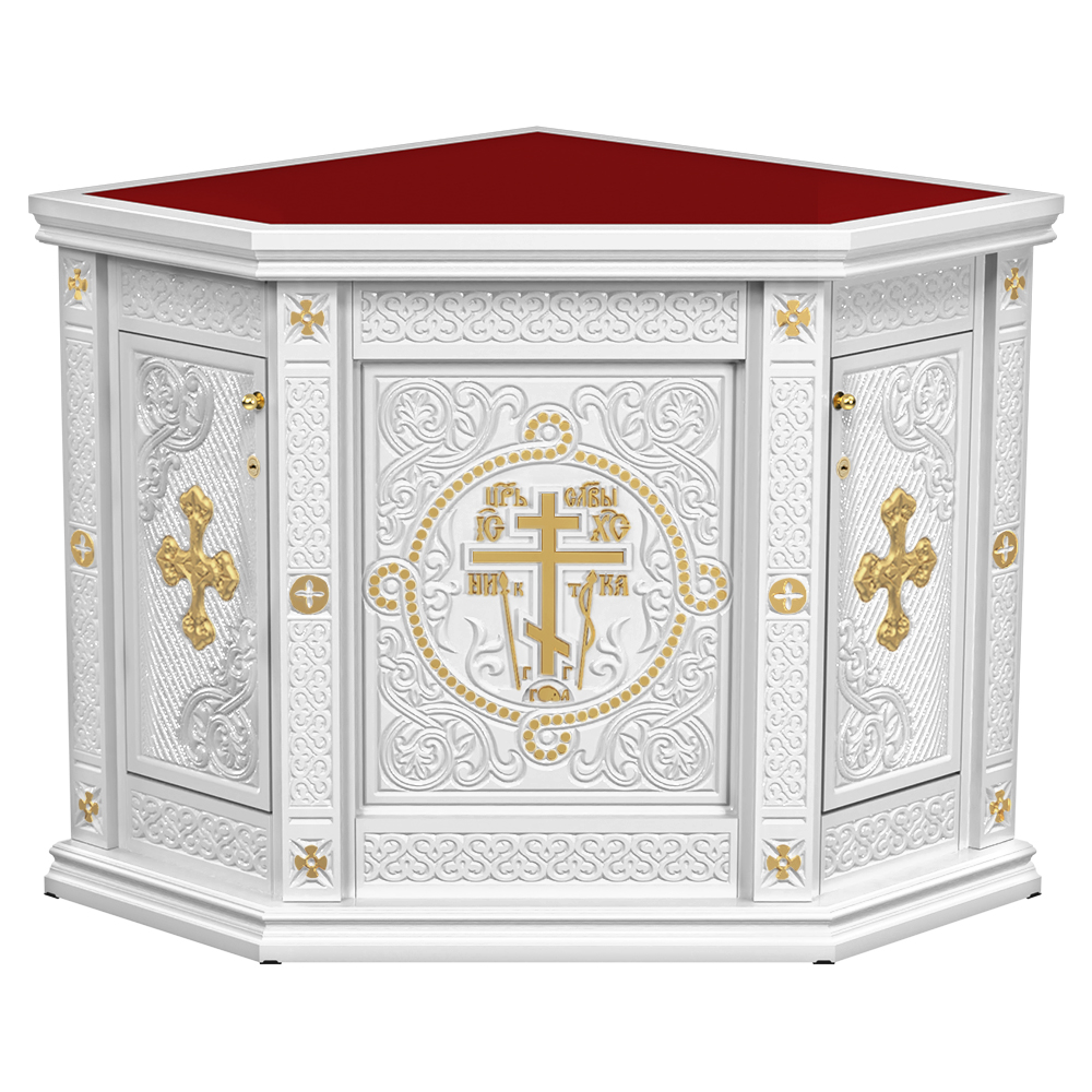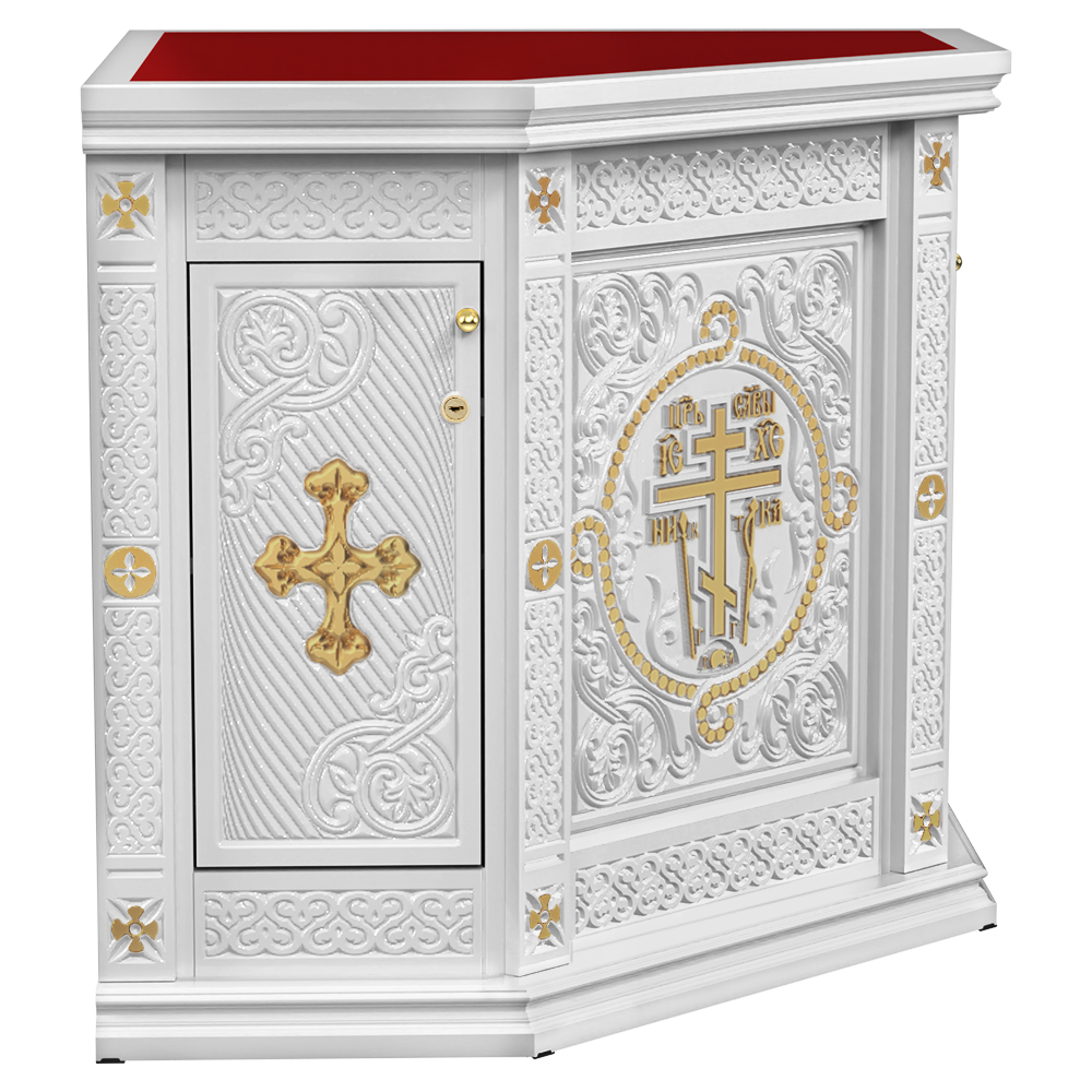 Жертвенник "Ярославский" угловой конструкции изготовлен из натурального дерева. Для отделки столешницы выбрана красная мебельная ткань. Передняя и боковые стенки украшены орнаментальной резьбой. За дверками скрывается вместительное внутреннее пространство. Возможно изготовление жертвенника в трех вариантах размеров.