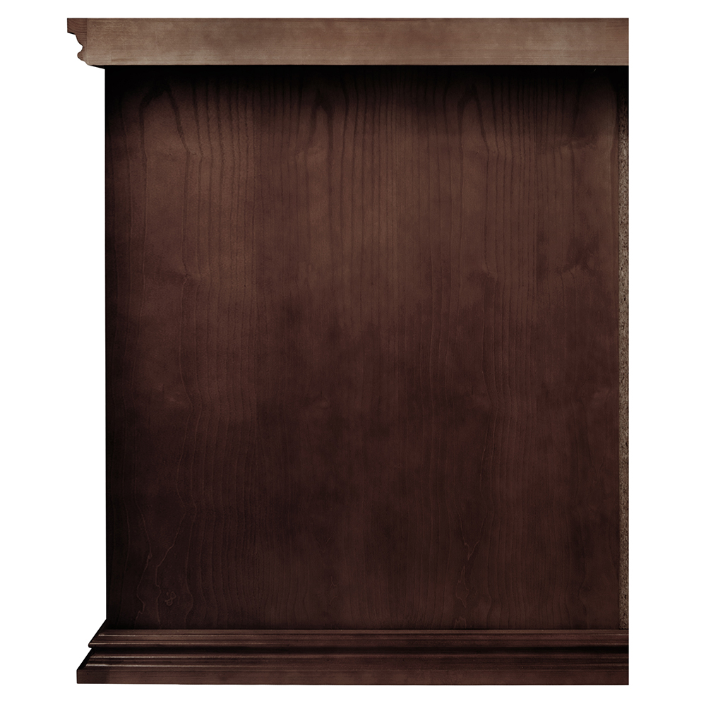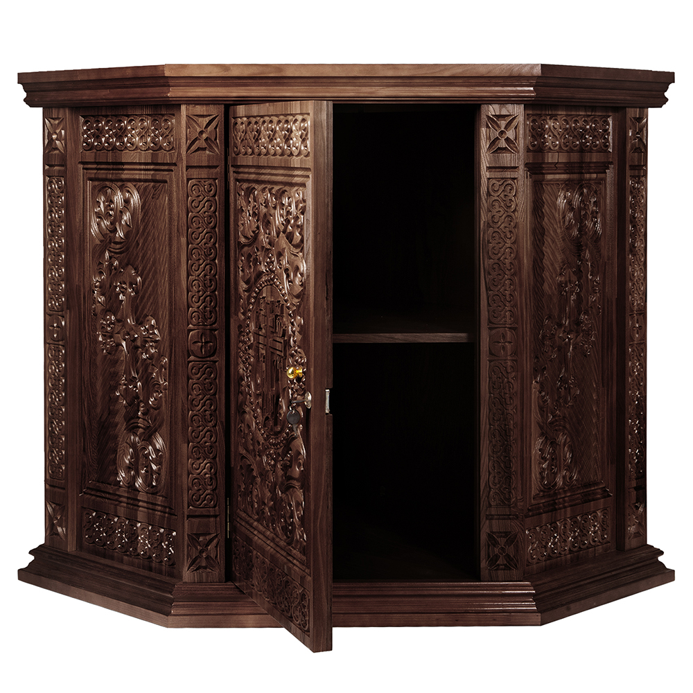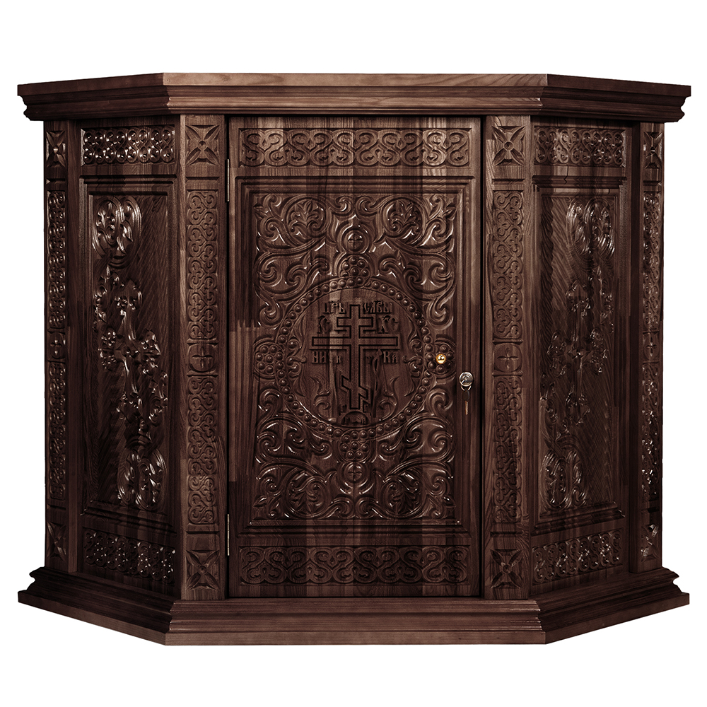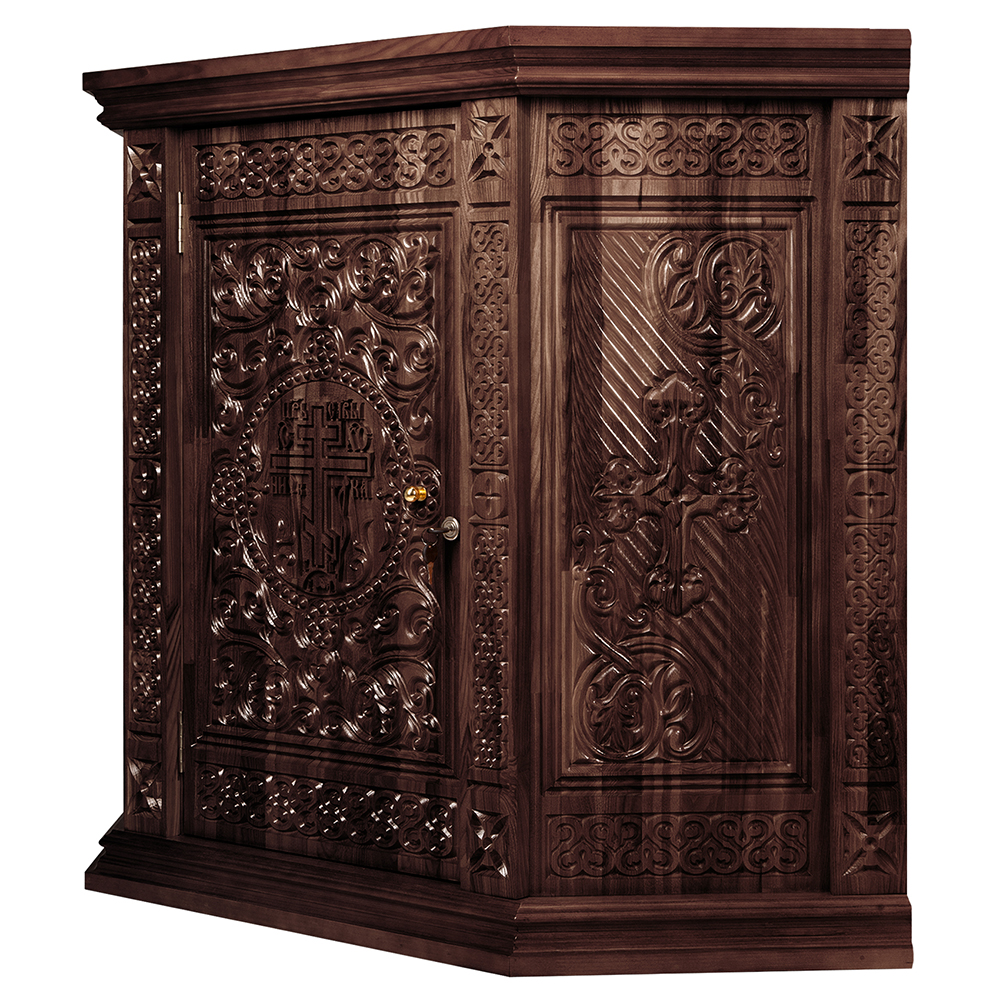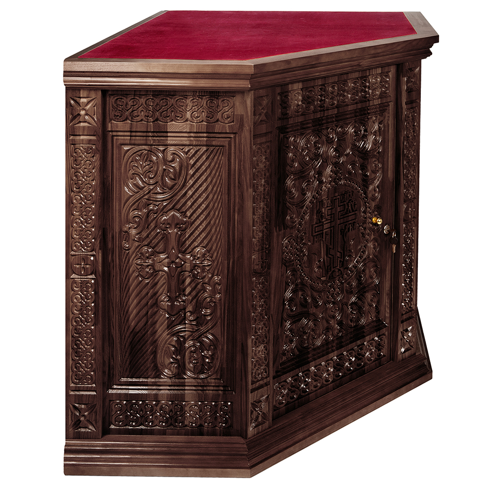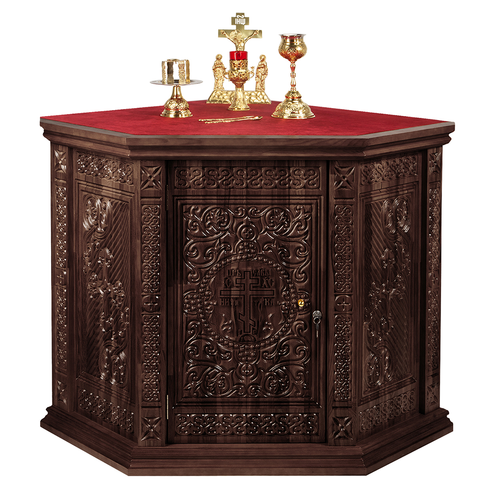 Жертвенник "Ярославский" угловой конструкции изготовлен из натурального дерева. Для отделки столешницы выбрана красная мебельная ткань. Передняя и боковые стенки украшены орнаментальной резьбой. За дверцей скрывается вместительное внутреннее пространство, разделенное полкой.