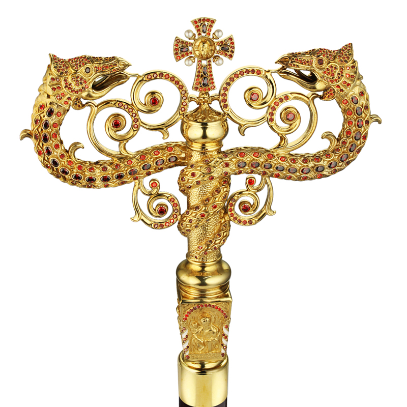 Навершие архиерейского жезла изготовлено из ювелирного сплава и покрыто тонким слоем золота гальваническим способом. Гальваническое золочение гарантирует неизменный внешний вид изделия на очень длительный период времени и простоту в уходе. Вся поверхность навершия декорирована россыпью качественных фианитов ручной закрепки.
